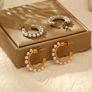 Pendientes de aro en forma de C, accesorios de venta caliente, pendientes de perlas completas de acero inoxidable con hilo chapado en oro de 18K para mujer